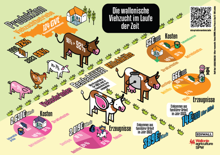 Die wallonische Tierhaltung befindet sich im Wandel: weniger Betriebe, aber größere und zunehmend spezialisierte. Die Rentabilität der Milchviehbetriebe bleibt insgesamt stabil. Dagegen weisen die auf Rindfleisch spezialisierten Betriebe strukturell eine geringe Rentabilität auf. Der Sektor muss sich an neue wirtschaftliche und ökologische Rahmenbedingungen anpassen und gleichzeitig verschiedenen Krisen begegnen.